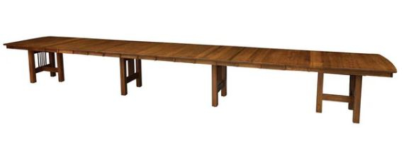 USA table builders are offering Amish-Type Trestle-Supported Leaves Extension Tables of 6.5 Ft long closed to "pull-apart tables" up to 20 feet long by inserting up to 14 added-leaves of 12" wide by 42" to 48" across with "Dual-Trestle Table Center Supports" to seat 2 to 20+ persons. See Trestle Dining Table Below: