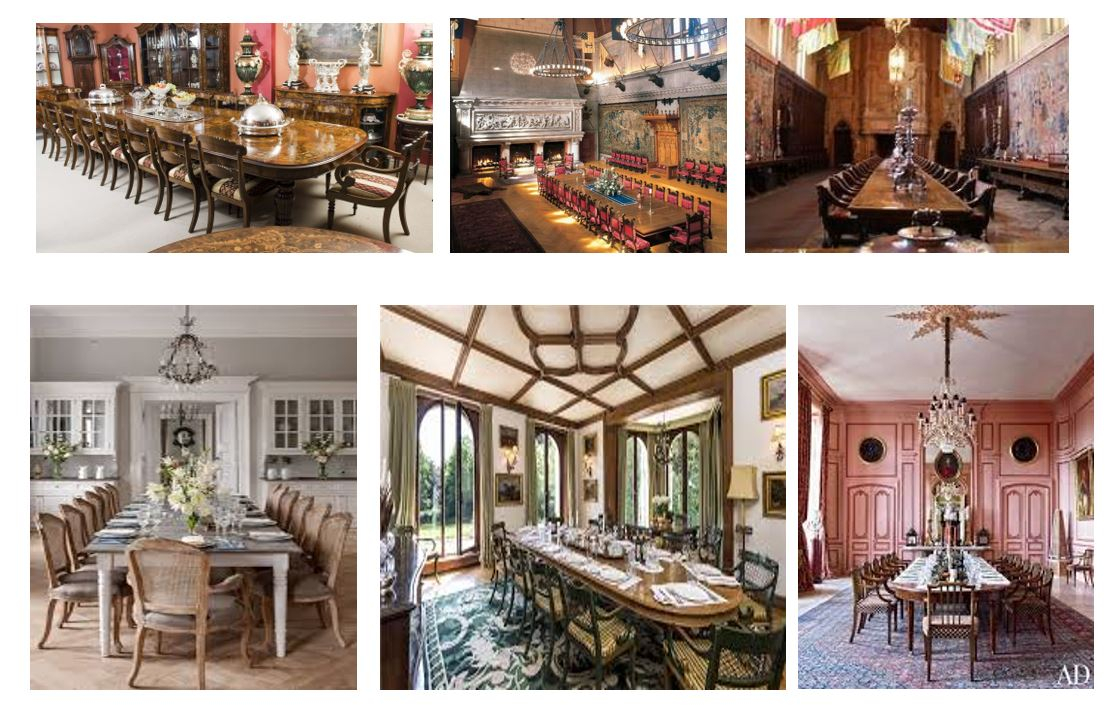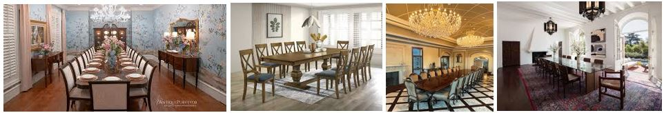 Today, there are over 5-Million estate-size home residences in the USA with over 8,500 SF living areas, with long dining rooms or halls for family and guests dinner party events. The Dining Table lengths in these residences are often 12 Ft - 20 Ft or longer as Fixed-Length Custom Tables, or Pull-Apart Extension-Leaves Trestle-Support type dining tables that go from 6 Ft to 20+ Ft extended-length, shown below to seat 2 - 20+ Persons!