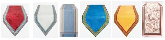 These Ensemble Sets are offered in 4 - scaled prices & sizes to seat: $235 2 - 8 persons, $375 2 - 12 persons, $470 2 - 16 persons, and $615 2 - 20 persons. Candles, Flower Vaces, Serving Pieces, Tidy Bread Baskets can be placed atop the Table Runners...See 8 Ensemble Designs Illustrated below: