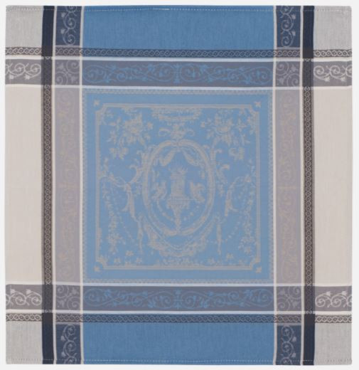 Transform with Versailles History your dining or patio table into a vision of Parisian history and charm with the 64" Square Marat Jacquard Versailles Blue, Gray, and White Tablecloth Ensemble Set that includes: 1-Tablecloth, 4-Matching Napkins and 1-Matching Tidy Fabric Bread Basket.