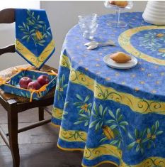 "Complete the Tissus Toselli Cigales Locusts on Blue French 2-6 Place 8-Pcs Tabletop Ensemble Set: This Ensemble Set includes: 1 -70" Round Wipeable Coated-Cotton Tablecloth, 6-Matching Napkins & 1 - Matching Tidy 8" Square 4-Corners Tie-Up Coated-Cotton Stain-Proof Fabric Bread Basket.