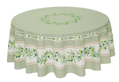 "Complete the Tissus Toselli Green Olives on Green French 2-6 Place 8-Pcs Tabletop Ensemble Set: This Ensemble Set includes: 1 -70" Round Coated-Cotton Tablecloth, 6-Matching Napkins & 1 - Matching Tidy 8" Square 4-Corners Tie-Up Coated-Cotton Stain-Proof Fabric Bread Basket.