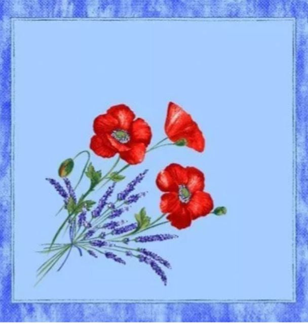 Featuring bold red poppies and delicate lavender blooms, the lively design adds a cheerful touch to any dining space, while the Blue background creates a serene and refreshing ambiance. Perfect for indoor or outdoor dining, this tablecloth embodies the charm and elegance of Provence, making it a standout piece for any occasion of 2 to 6 people.