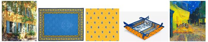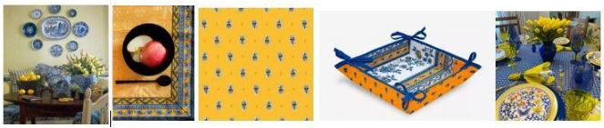 7. $175 Yellow & Blue are the Most-Loved Colors for "Sunny Provence France".  You will Present a Majestic Tabletop to Cheer Every Dinner Guest for seating 2-8 Guests within your dining room, outdoor garden or terrace on a 5 Ft - 8 Ft dining table and at least 40" wide. Includes  8 - Blue Border on Yellow Placemats |  8 - Blue Buds on Yellow 18" Cotton Napkins | 2 - Tidy 4-Corner Tie Bread Baskets!
