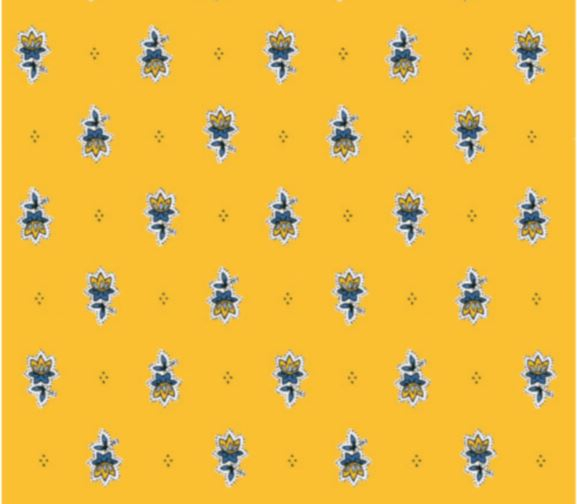 Dress your French Provence or French Country Dining Table with the 60" Round MARAT Tradition Blue Filigree Banner on Yellow Tablecloth. This authentic French Provence tablecloth showcases a vibrant blue floral filigree design, inspired by the colors of the Mediterranean sun and sky.
