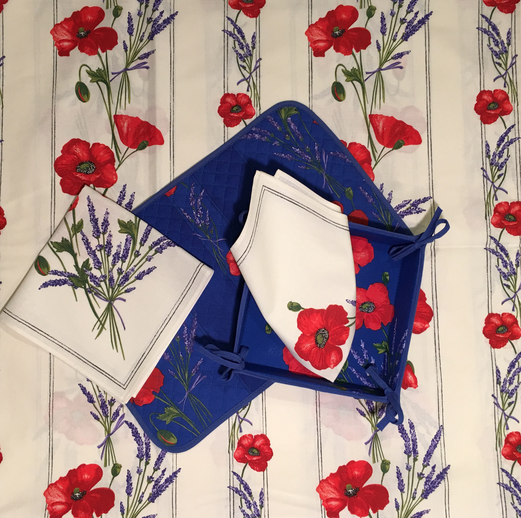 Featuring bold red poppies and delicate lavender blooms, the lively design adds a cheerful touch to any dining space, while the White background creates a serene and refreshing ambiance. Perfect for indoor or outdoor dining, this tablecloth embodies the charm and elegance of Provence, making it a standout piece for any occasion.