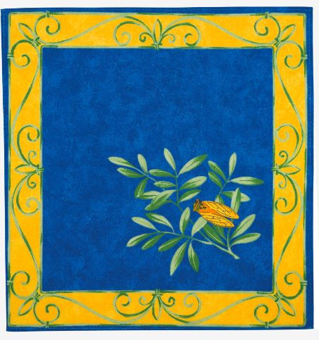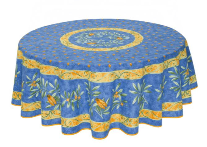 Transform Your Table with Provence Elegance Introduce the charm of Provence to your dining space with the 70" Round Tissus Toselli Cigale Locusts Tablecloth in finest Egyptian Stain-Proof Acrylic-Coated Cotton. Featuring an intricate design of locusts on a rich blue backdrop with tones of green, yellow, and black, blends effortlessly with garden landscapes and various interior dining color schemes.