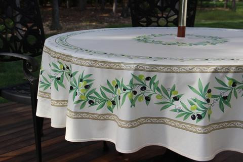 Set your table with this 70" Round Tissus Toselli Ramatuelle Olives & Leaves Tablecloth White on green Authentic French Provence cotton print tablecloth of the finest Quality "Egyptian Cotton Fabric" in Plain Cotton.
