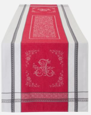 Display the Essence of "Romance in Provence" on your Square 30" to 40"+ bistro cafe syle dining table with the TISSUS TOSELLI 64" x 20" Romantique (Romance) Table Runner. Crafted from premium jacquard-woven stain-proof cotton, this radiant runner features wide burgundry center banner framed by an elegant light 7dark grey filigree cadre border.
