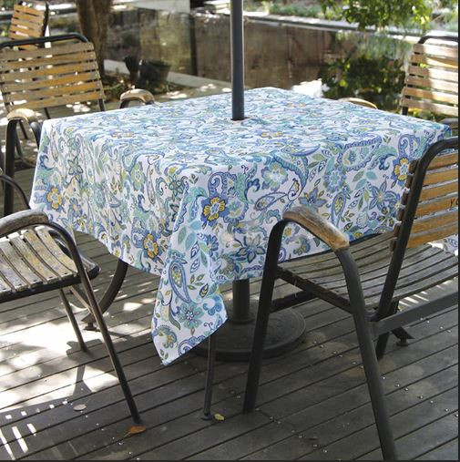 See Illustration of a tablecloth with a Grommet-Ring to slide the umbrella pole through the hole in both tablecloth and tabletop to weighted base below!