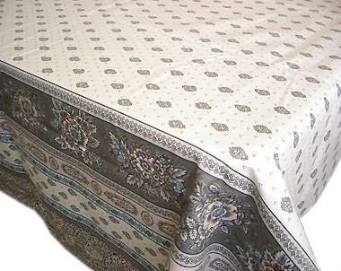 You're reviewing: $55 60" Sq Turquoise & Grey Filigree Banner on White Stain-Proof Cotton Tablecloth - Use on a 30 to 45 inch square table for 2 to 4 Place Seating or use a Slip-Leaf Expansion-Length Rectangular Table that seats 4 to 6!