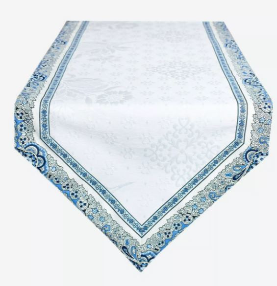 Enjoy a Blue/White/Grey Color Essance of Blue Sky on Your Dining Room Table. Seat 4 - 16 Dinner Guests on a 6 Ft - 16 Ft dining table.  Includes 2 - 60" x 20" Jacquard Woven Table Runner with White Delft Center | 16 - Blue & White Placemats |  16 - Blue Calisson Buds on White 18" Cotton Napkins | 4 - Tidy 4-Corner Tie Bread Baskets!