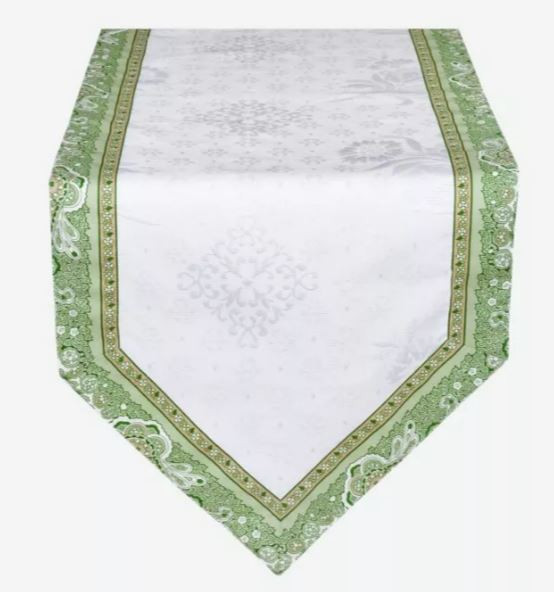 Present a Gentle Garden Green Ambiance Over Your Entire Dining Tabletop for seating 4-20 Guests within your dining room, outdoor garden or terrace on a 6 Ft - 20 Ft dining table and at least 48" Wide.  Includes 3 - 60" x 20" Jacquard Woven Table Runner with Green Filigree Border | 20 - Green Border on White Placemats |  20 - Green Calisson Buds on White 18" Cotton Napkins | 5 - Tidy 4-Corner Tie Bread Baskets!