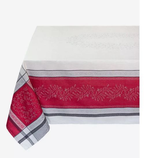 Add a touch of Provence to your dining table with the 64" Square Tissus Toselli Jacquard Olivia Gray & Burgundy Tablecloth. Inspired by Mediterranean olive grove artistry, this tablecloth features a stunning olive design woven into soft gray and rich "Red Wines Burgundy Tones".