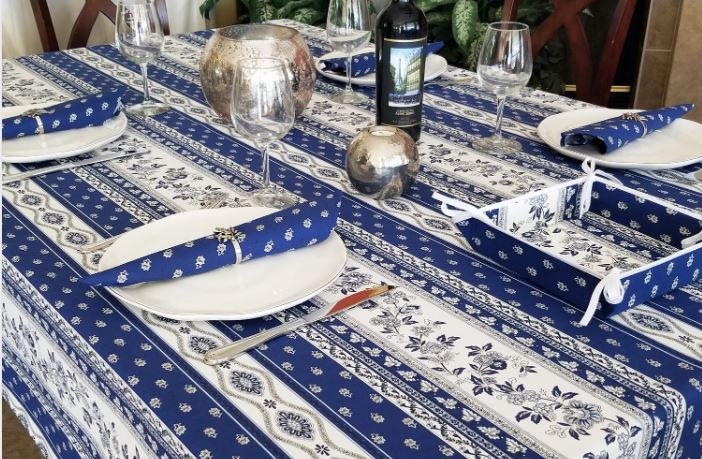 You're reviewing: $99 60" Sq 2-4 Place 6-Pcs Ensemble Set of 1-Avignon Blue on White Stain-Proof Coated Cotton Tablecloth +4 Matching Napkins +1 Tidy Fabric Bread Basket - – Enjoy Royal Blue Cafe Dining Tabletop!